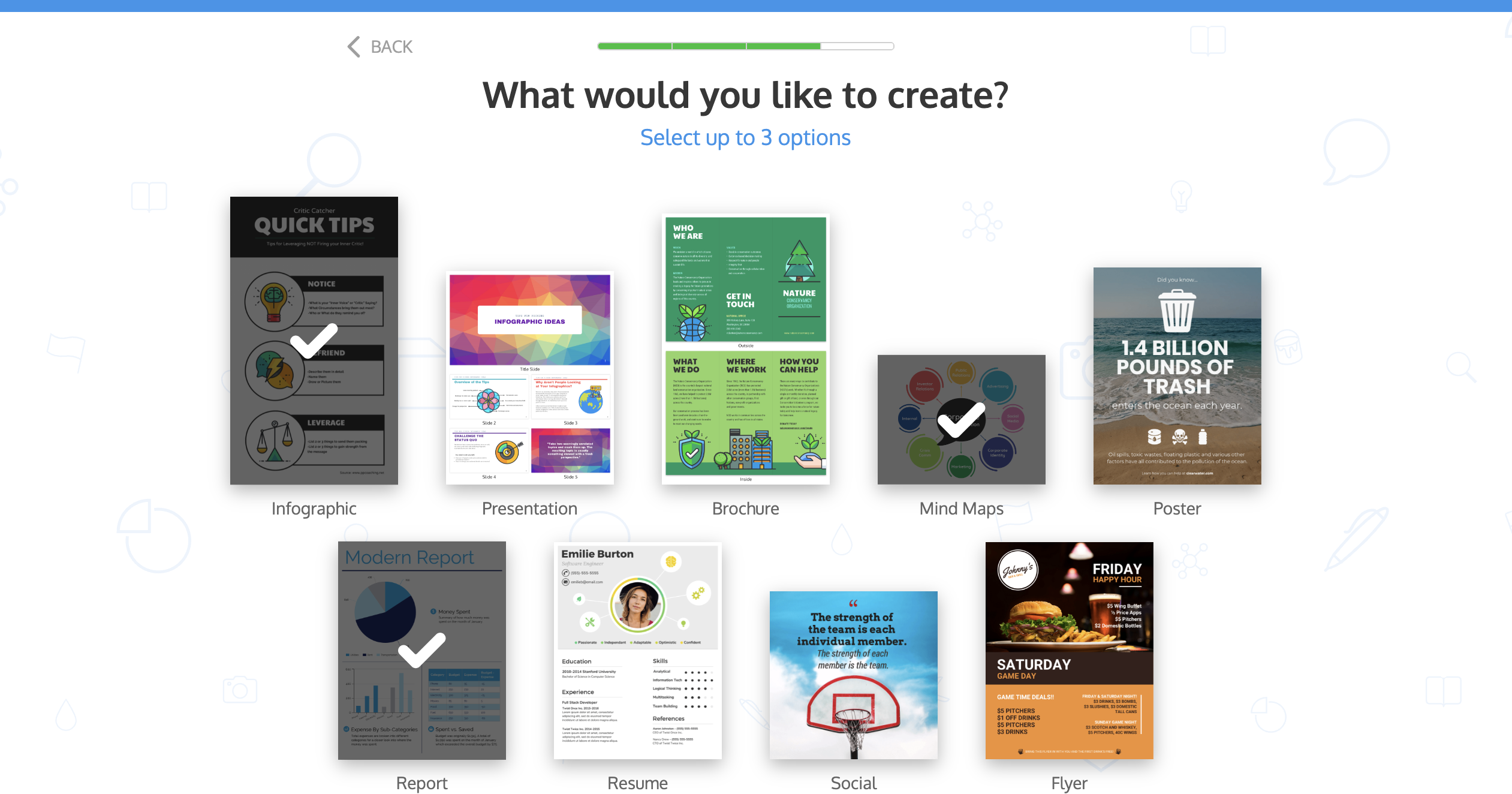 Then, you are prompted to pick three types of templates that you would like to create.