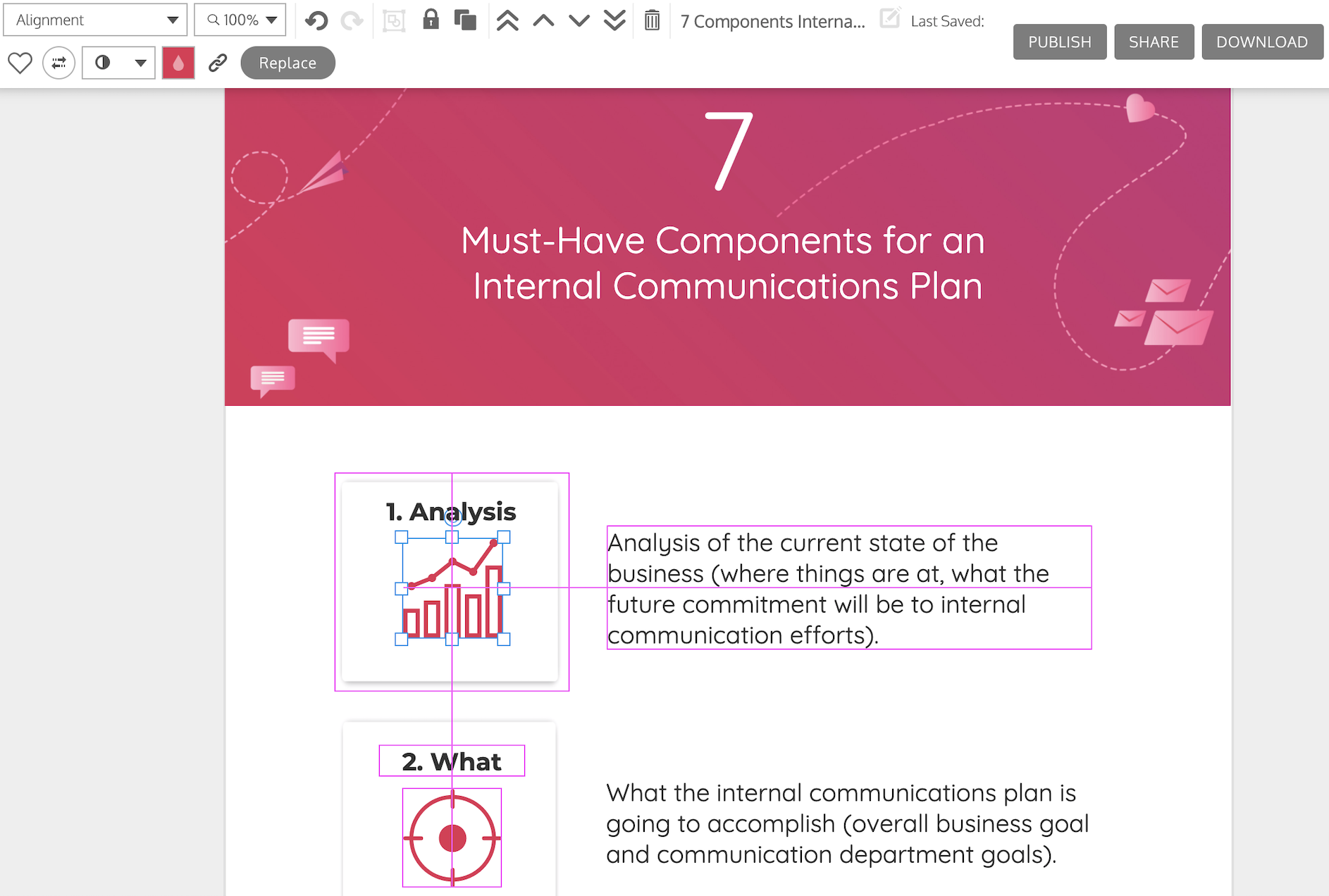 Venngage’s editor has a handy alignment tool that makes it easy to re-organize elements on the page. They also offer a grid view and page margins to help layout your designs for print.